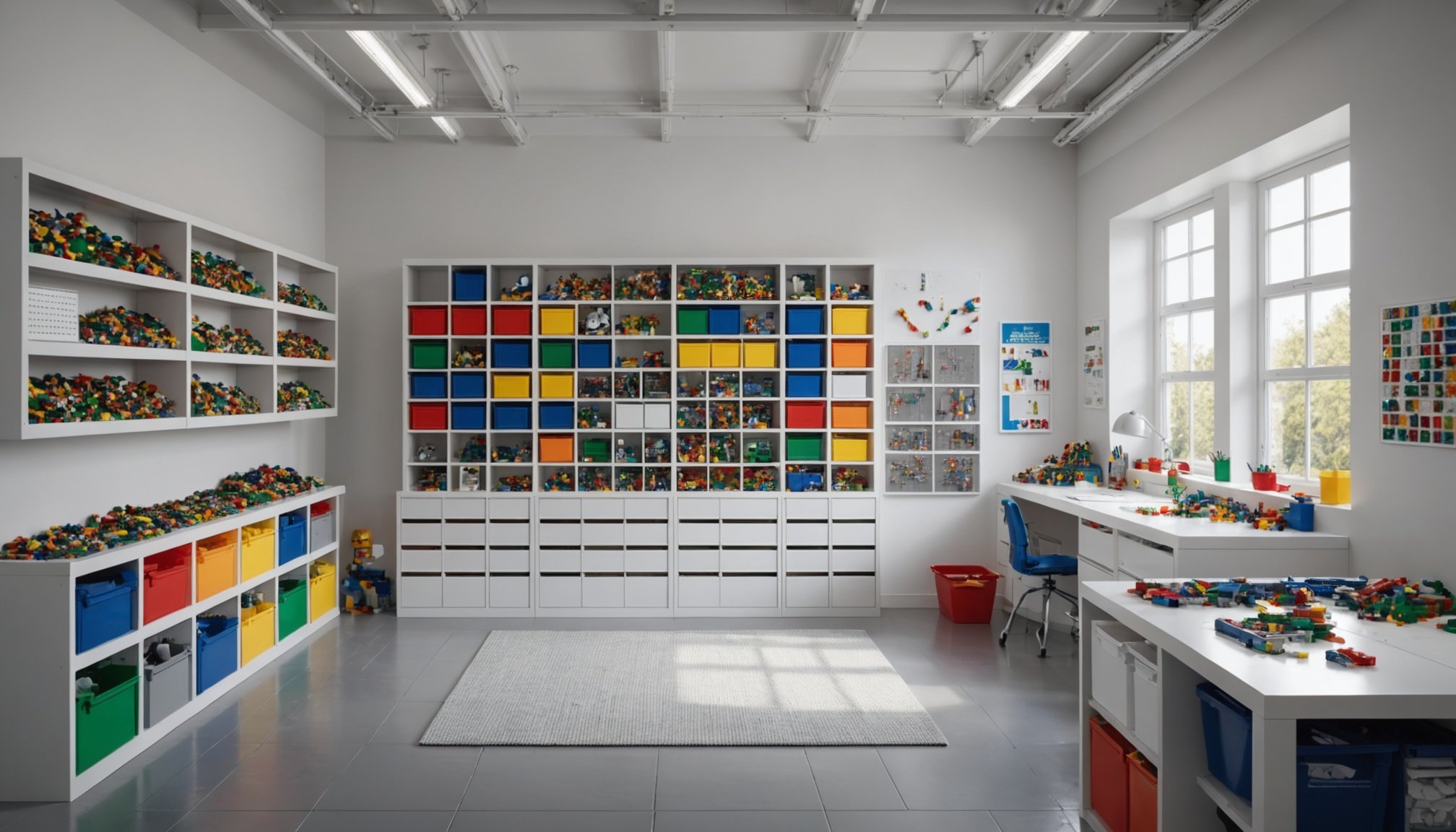 Pour les petites surfaces, exploitez la verticalité en installant des étagères modulables à différentes hauteurs. Une table de jeu avec tiroirs intégrés offre un double avantage : surface de construction stable et rangement immédiat des pièces utilisées. Les bacs transparents empilables maximisent l'espace tout en gardant les éléments visibles.